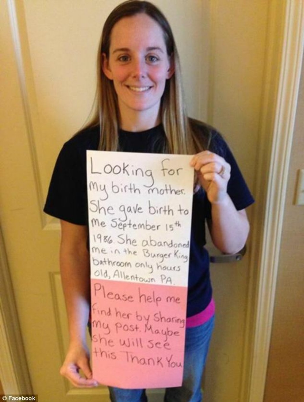 Vďaka Facebooku ju našla. Jej odkaz všetkých chytil za srdce: „ Hľadám svoju biologickú matku. Opustila ma na toaletách v Burger Kingu v Allentowne, keď som mala iba pár hodín. Pomôžte mi ju nájsť tým, že budete zdieľať túto fotku!"