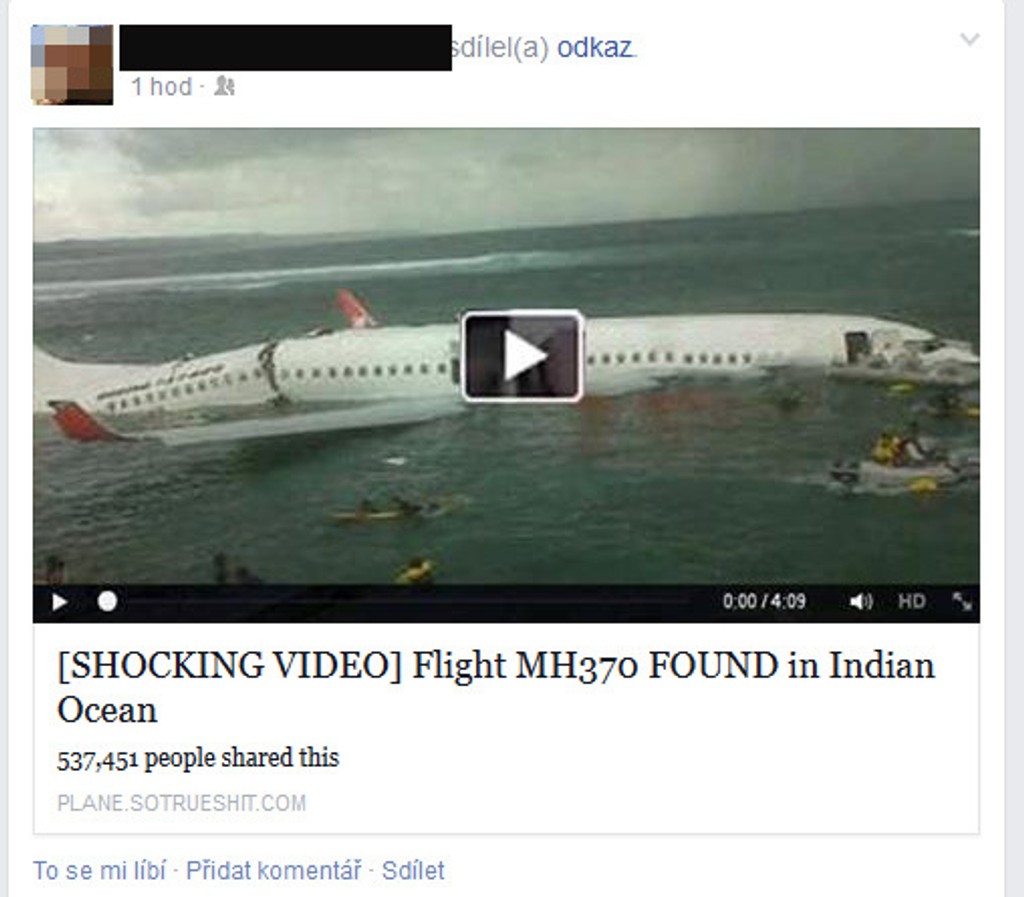 Celý svet dychtivo číta všetko o zmiznutom malajzijskom lietadle, čo zneužívajú podvodníci. Na Facebooku koluje video s exkluzívnymi zábermi nájdených cestujúcich. Ide o podvod. Aj vás na sociálnej sieti upútalo "video" s názvom Video: Malajzijské lietadlo MH370 našli v Bermudskom trojuholníku. Cestujúci žijú!? Nespustíte ho len tak, musíte naň kliknúť.