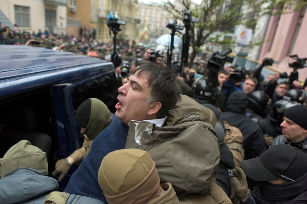 Ostrý kritik ukrajinského prezidenta Petra Porošenka vyliezol na strechu a pohrozil skokom dole. Na mieste zasahovali medici aj vyjednávači. Celý incident napokon skončil Saakašviliho zatknutím. Podľa očitých svedkov politika vyviedli z bytu spútaného, citoval idnes.cz portál newsru.com.