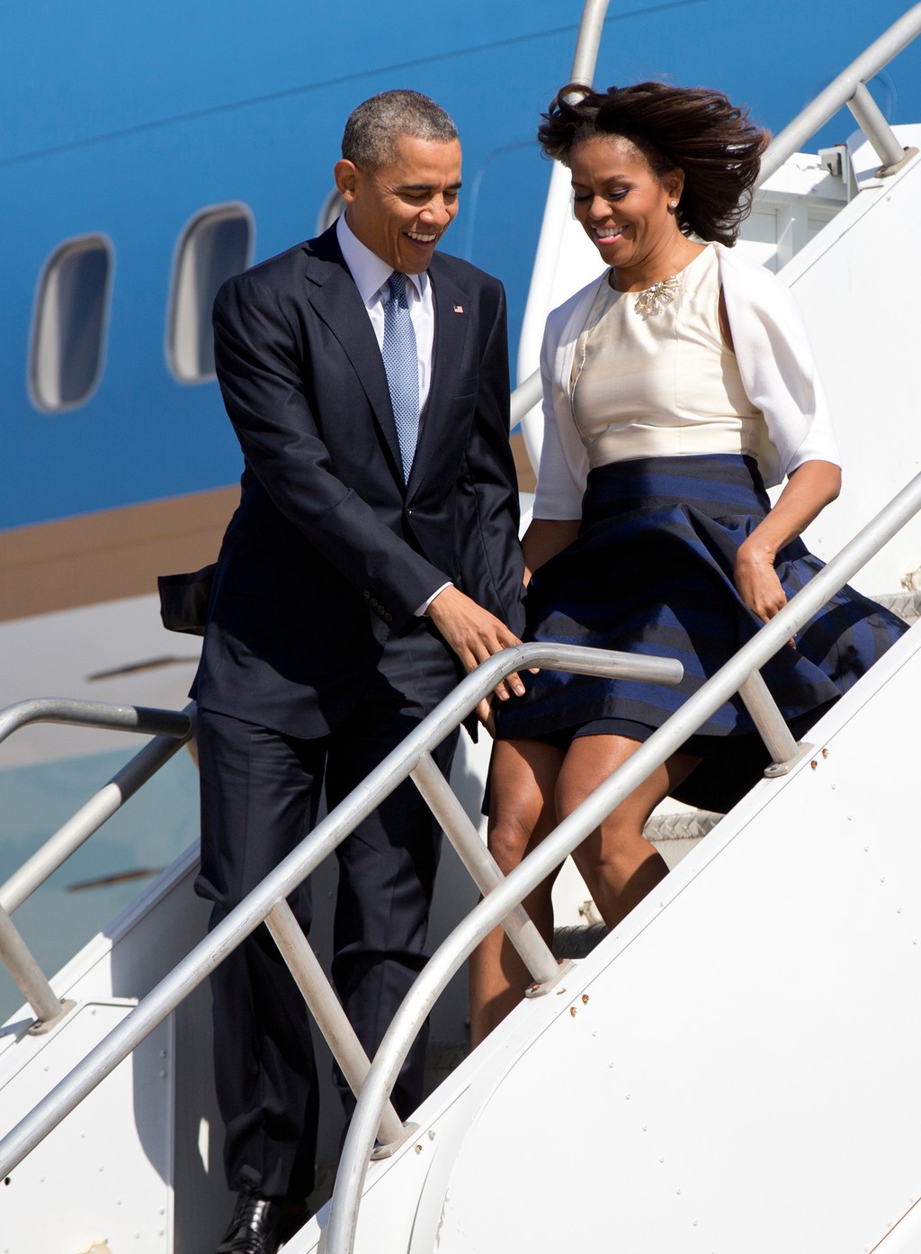 Na letisku v Houstone jej zachytil sukňu, aby jej ju nezdvihol vietor a neukázala tak to, čo nosí pod šatami. Stihol to v pravú chvíľu. Inak by prvá dáma nasledovala britskú vojvodkyňu Kate, ktorej sa vietor so šatami „zahral" už niekoľkokrát.