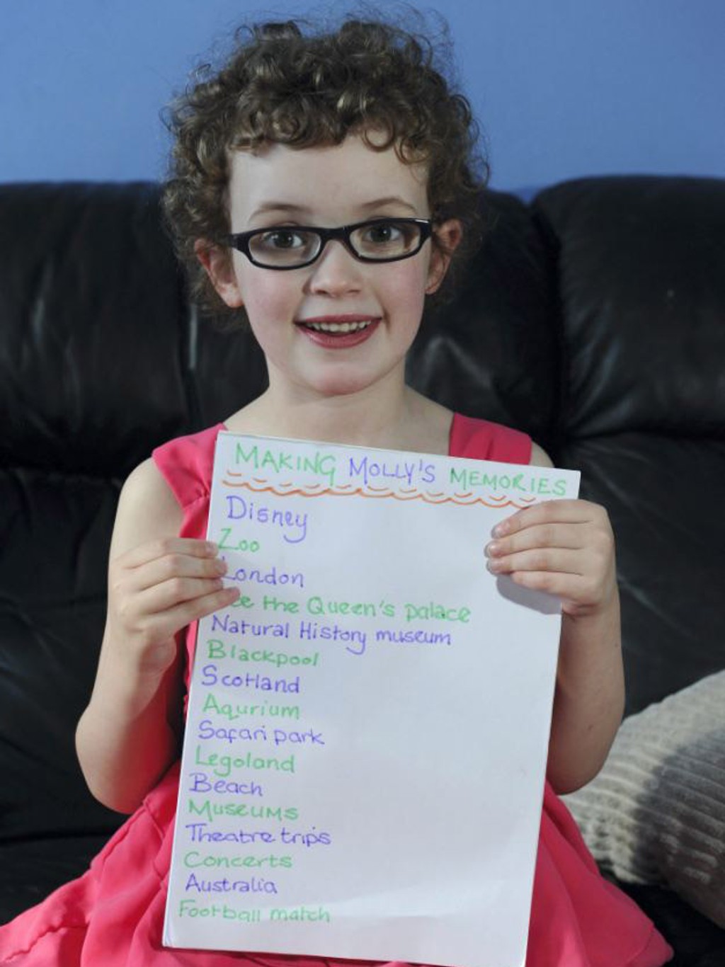 „Chceme jej pomôcť vytvoriť čarovné spomienky, ona miluje svet okolo seba," povedal jej otec Chris. Vedia, že jej nebudú môcť vyhovieť vo všetkom a neuvidí všetko, čo chce, ale aspoň sa o to pokúsia. Molly zatiaľ nosí okuliare, lebo zrak sa jej stále zhoršuje. Je to genetická choroba a trpí ňou aj brat jej matky.