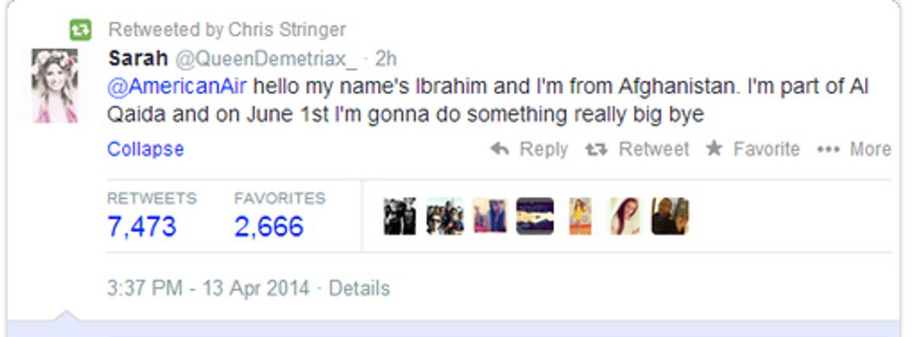 Polícia v holandskom meste Rotterdam zadržala 14-ročné dievča, ktoré na stránke leteckej spoločnosti American Airlines na sociálnej sieti Twitter zo žartu napísalo, že je Ibrahim, člen al-Káidy z Afganistanu a na 1. júna plánuje urobiť niečo veľké.
