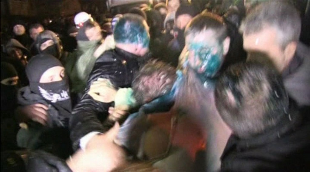 Oleha Carjova zbili radikálne naladení veteráni z Afganistanu a aktivisti tzv. AutoMajdanu, keď v pondelok večer odchádzal z budovy televízie ICTV v Kyjeve.