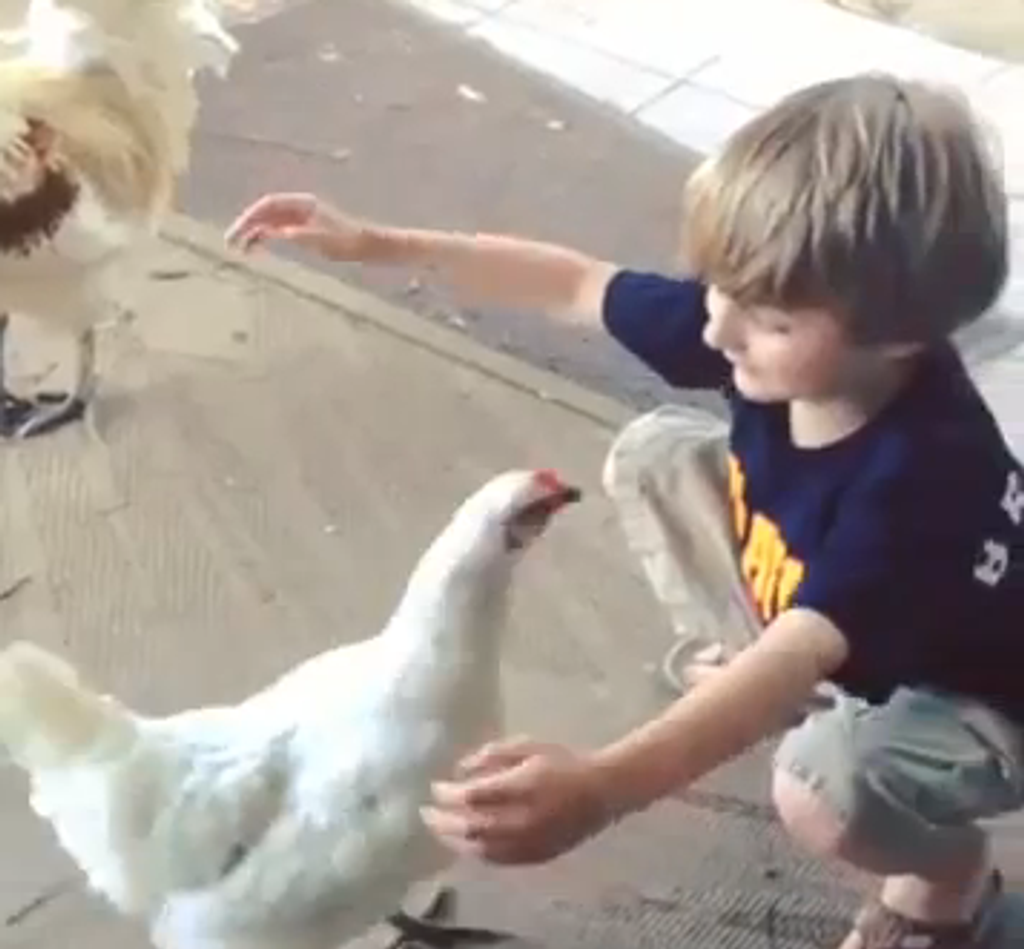 Takto to však vyzerá, keď sa na príchod chlapca domov teší sliepka. Chlapec si kvokne a vrúcne objíme svoju sliepku, ktorá sa nebráni. Práve naopak, silno sa k nemu pritisne bez toho, aby ho ďobla.