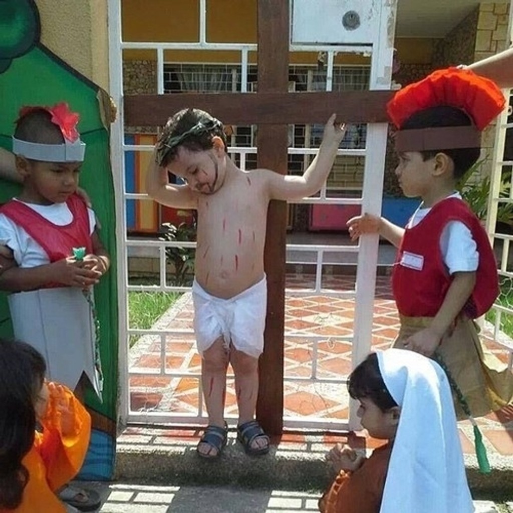 Hrali v ňom len deti. Malého predstaviteľa Ježiša ukrižovali dva rímski vojaci. Pri kríži kľačí plačúca Mária a Mária Magdaléna. Nevinnú fotografiu s prevažne negatívnymi komentármi zdieľalo už viac ako 230-tisíc ľudí.
