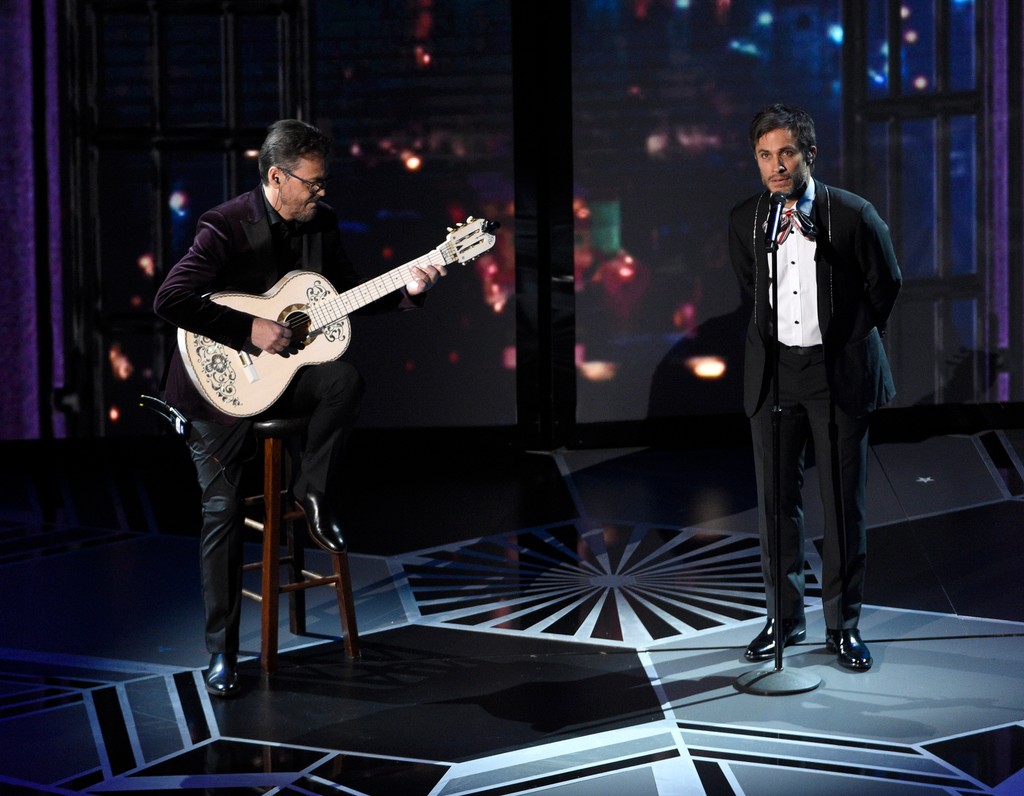 03:13 - Ďalšie spevácke vystúpenie večera: Skladbu Remember Me k animovanému filmu Coco zaspievali jej autori Miguel, Natalia Lafourcade a Gael García Bernal (na fotke vpravo).