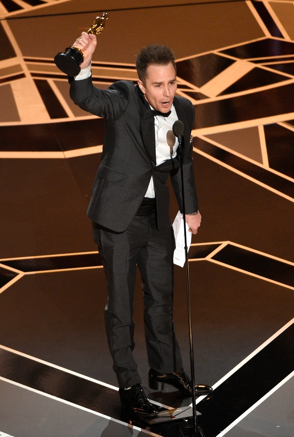 00:17 - Medzi prítomnými hosťami je už aj herec Sam Rockwell, ktorý je nominovaný v kategórii Najlepší mužský herecký výkon vo vedľajšej úlohe za film Tri billboardy kúsok za Ebbingom.