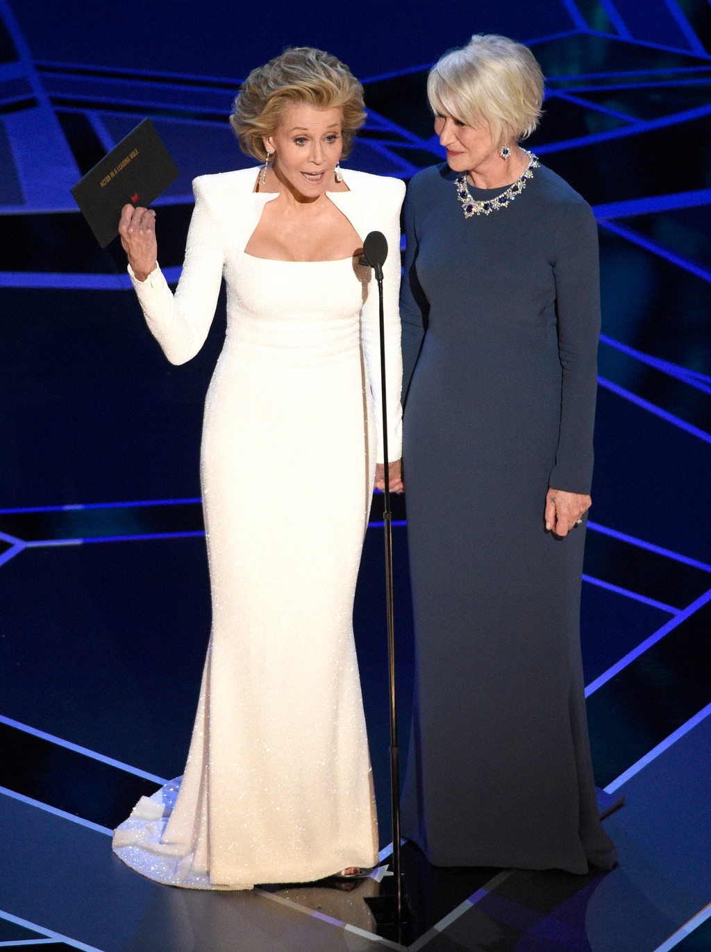 05:20 - Na pódium prišli Jane Fonda a Hellen Mirren, aby predstavili nominácie v kategórii Najlepší mužský herecký výkon v hlavnej úlohe. "Táto výzdoba je ako orgazmus!" zavtipkovala Jane Fonda.