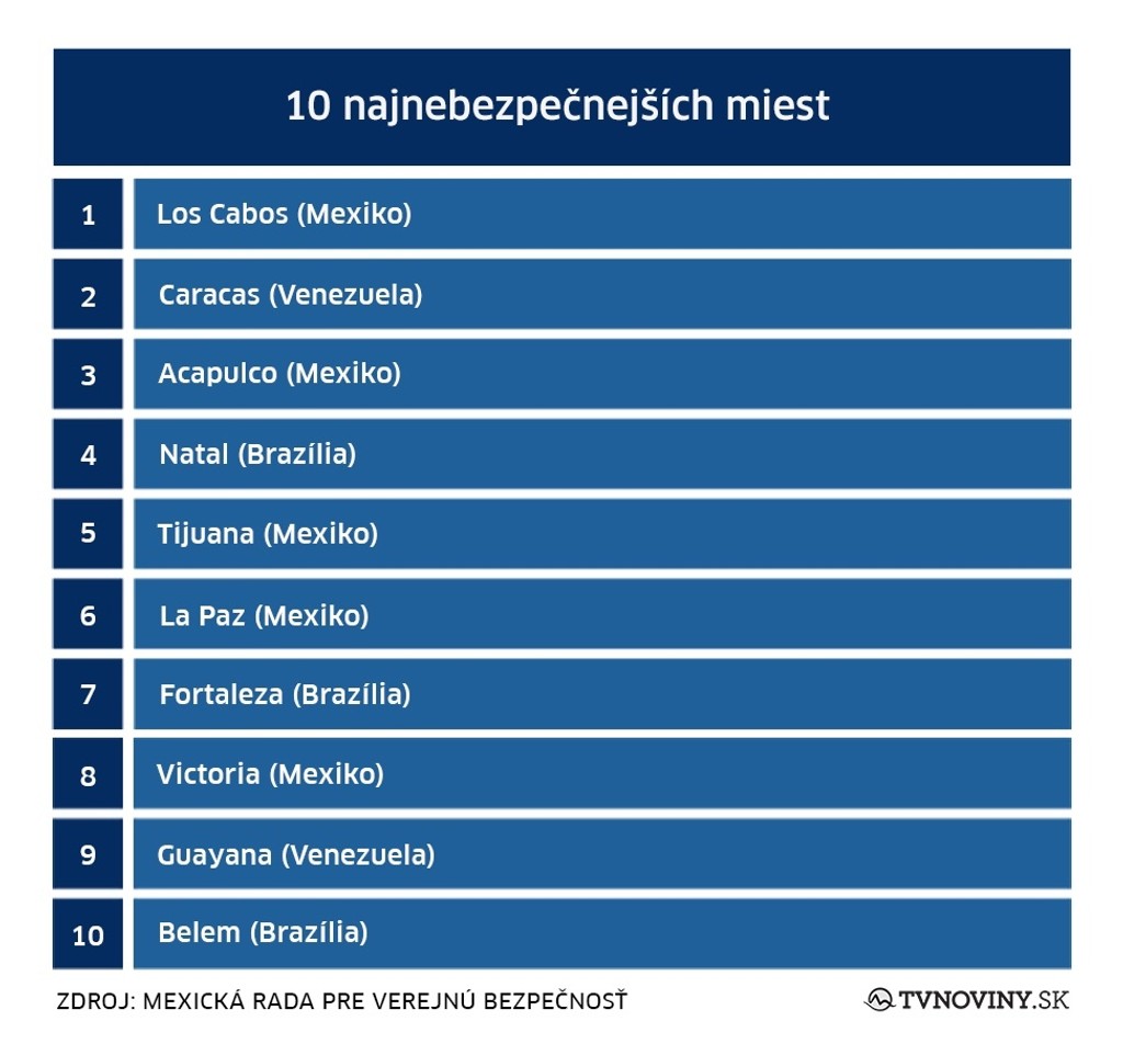 Najnovší rebríček 50 najnebezpečnejších miest na svete zostavila Mexická rada pre verejnú bezpečnosť podľa úrovne kriminality, uviedol britský portál Daily Mail. Zameriavala sa iba na mestá, ktoré majú viac ako 300-tisíc obyvateľov, pretože iba tie vedú štatistiky o počte vrážd za rok.