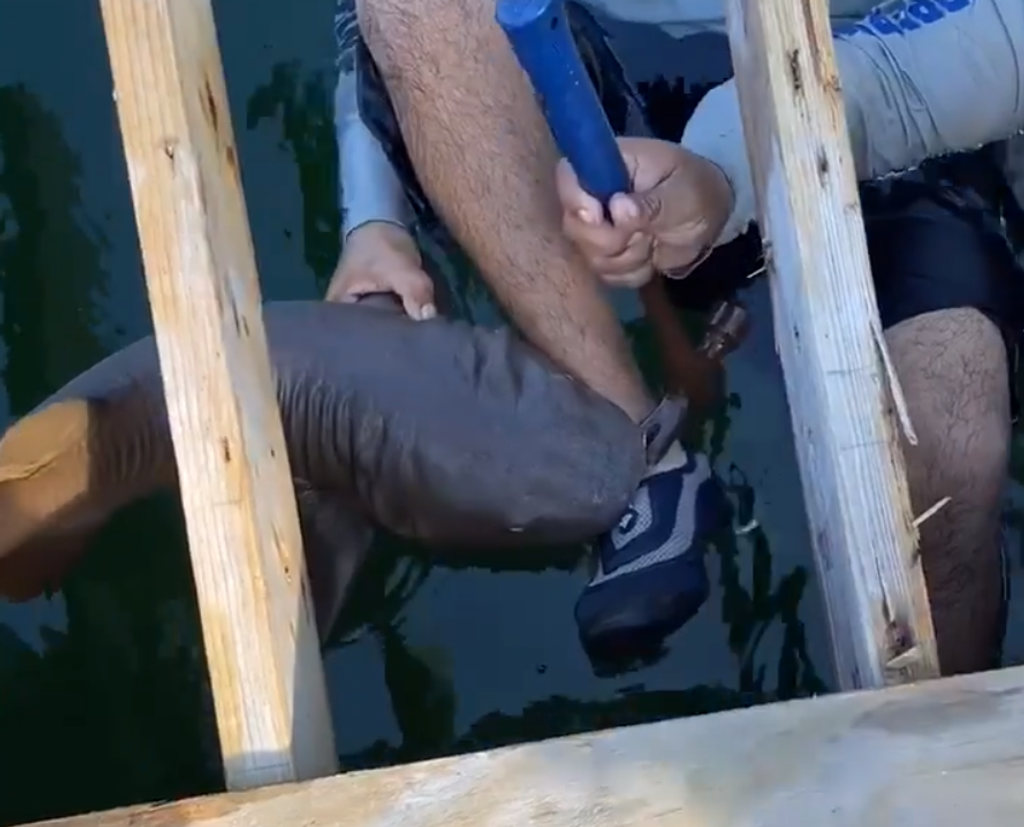 Našťastie však išlo o mladého jedinca, ktorý mužovi nemohol spôsobiť život ohrozujúce zranenia, no vyskytol sa iný problém - predátor nohu odmietol pustiť. Garcia sa snažil zovretie uvoľniť, no dlhé minúty sa mu to nedarilo, tak sa so žralokom snažil dostať na mólo.