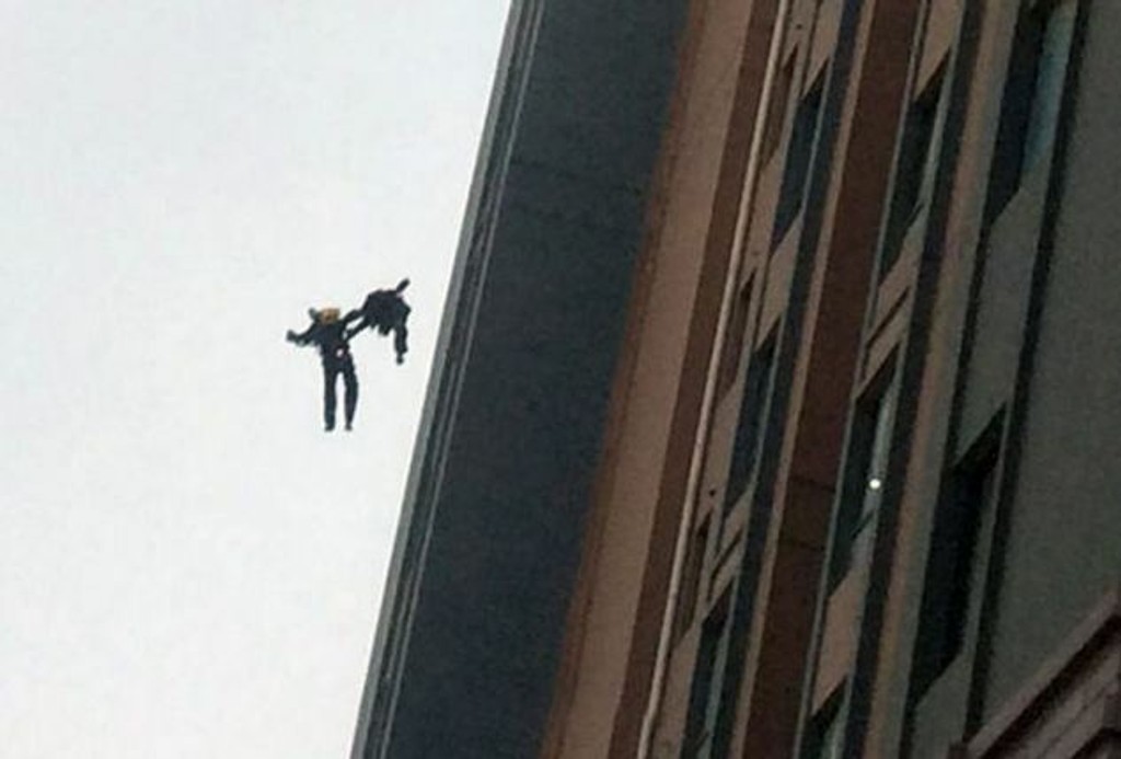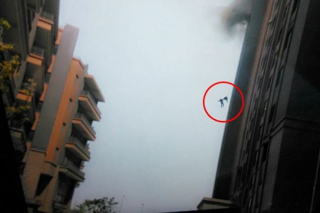 Qian Lingyun (23) a Liu Jie (20) sa snažili uhasiť požiar bytovky v Šanghaji. Bol ale nad ich sily. Plamene jedného z nich vytlačili von cez okno. Kolega sa ho snažil zachrániť a vytiahnuť späť.