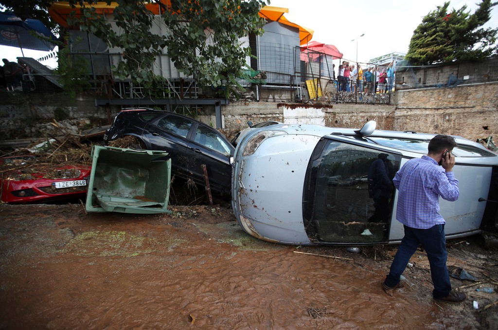 Na otvorenom parkovisku v meste Marusi na predmestí Atén vytvorila náhla smršť rozbahnené jazierko vody, v ktorom plávali odstavené autá.