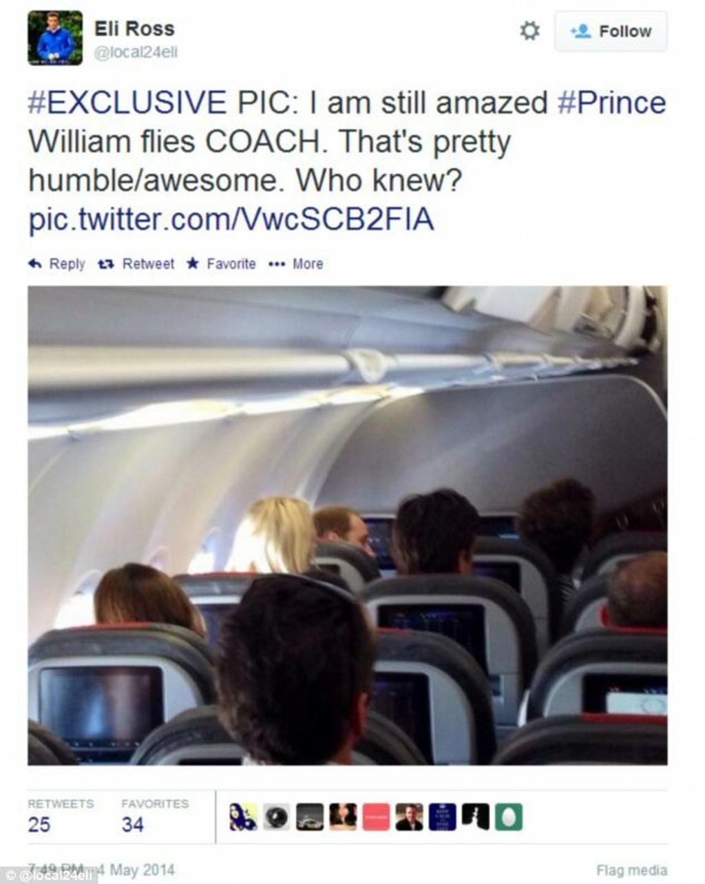 „Som v úžase. Princ William na palube," napísal Eli Ross. Podľa svedkov mal William oblečené džínsy, biele tenisky a na hlave mal šiltovku. Zdá sa, že sa ani len nepokúšal pútať pozornosť. Ostrému zraku redaktora a ďalších svedkov však neunikol.