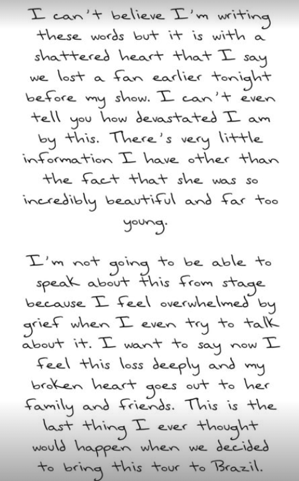 Podľa brazílskych novín fanúšička Ana Clara Benevides upadla do bezvedomia, informuje Guardian. Americký People dopĺňa, že žena sa už predtým necítila dobre. Záchranári ju previezli do nemocnice, kde mala zomrieť na zástavu srdca. Organizátori koncertu však príčinu smrti podľa TASR nešpecifikovali.