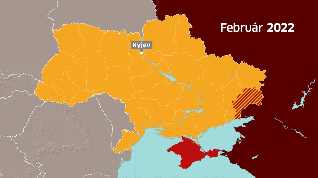 Vraciame sa do roku 2022, keď sa boje začali. Červenou farbou na mape Ukrajiny je znázornené územie, ktoré Rusi dobyli už v prvých týždňoch – obsadili značnú časť pohraničnej oblasti s Bieloruskom a východ.