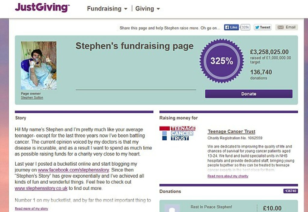 V januári 2013 si tak Stephen vypracoval zoznam vecí, ktoré chce ešte stihnúť pred smrťou. Prvé miesto ale nepatrilo jeho potrebám. Chcel vyzbierať 10-tisíc libier pre Teenage Cancer Trust. Nádejný budúci lekár odišiel zo školy a plne sa sústredil na svoj cieľ. Išlo mu to tak dobre, že sa rozhodol zvýšiť sumu na rovný milión.