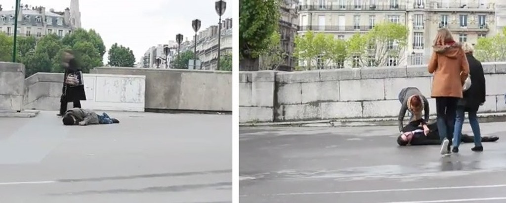 Po tom, čo sa chvíľu motal po ulici, spadol na zem. Asi päť minút sa zvíjal od bolesti a prosil o pomoc, nikto z okoloidúcich však k nemu neprišiel. Druhý figurant mal na sebe oblek a vyzeral ako businessman. Po tom, čo on spadol na zem, k nemu ihneď pribehli viacerí okoloidúci a pýtali sa ho, či je v poriadku.
