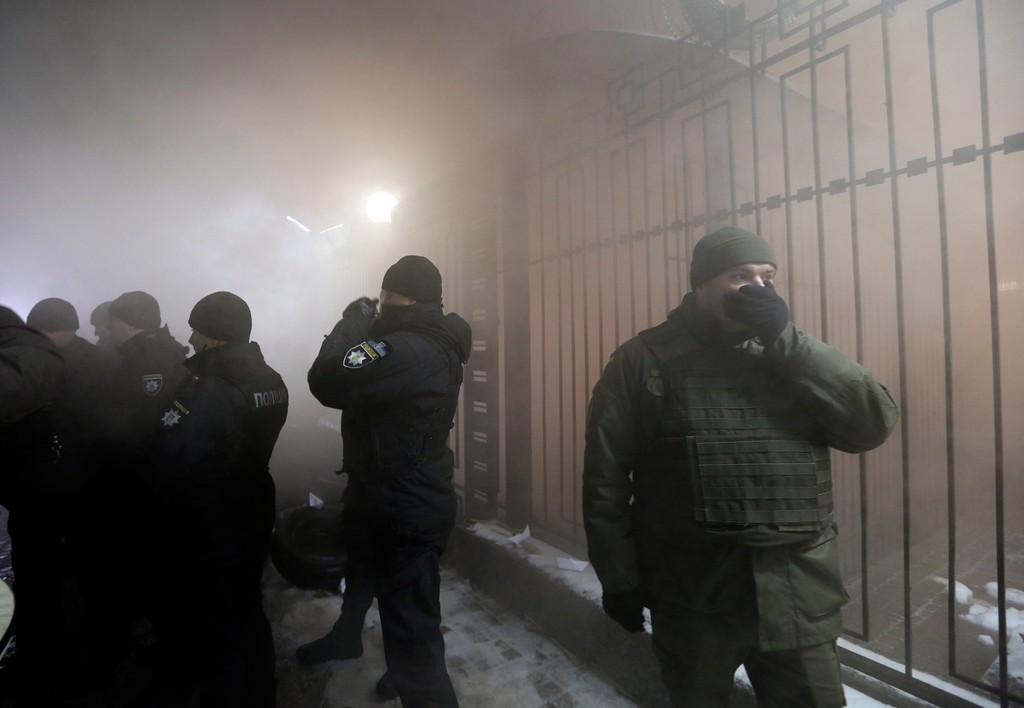 Okrem toho sa večer pred veľvyslanectvom zhromaždilo niekoľko desiatok ľudí, ktorí skandovali "Smrť Rusku!" a hádzali smerom k budove dymovnice. Podľa očitých svedkov účastníci akcie na plot okolo areálu rozvešali aj loďky poskladané z papiera na protest proti námornému incidentu z nedele.