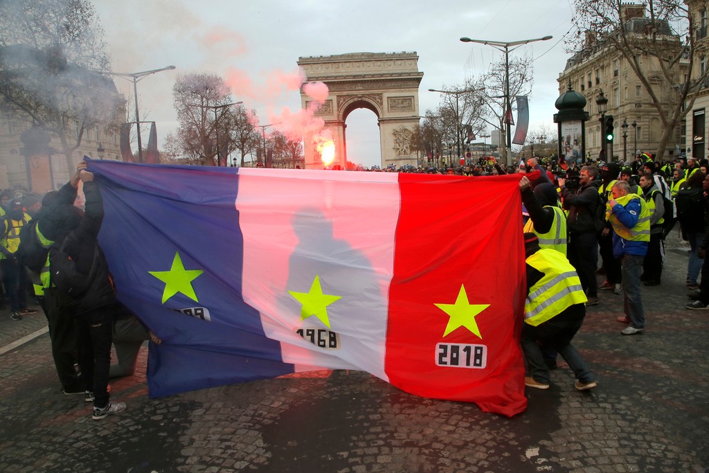 Výkriky vyzývajúce na odstúpenie prezidenta Emmanuela Macrona sa zmiešali z mrakmi slzotvorného plynu, ktorým polícia zasahovala na bulvári Champs-Élysées, a na rôznych miestach stúpali do vzduchu husté stĺpy čierneho dymu. Výtržníci vyplienili početné obchody.