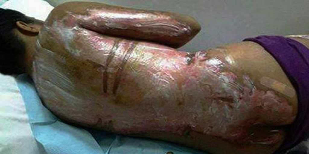 Má obrovské jazvy na chrbte a nohách.