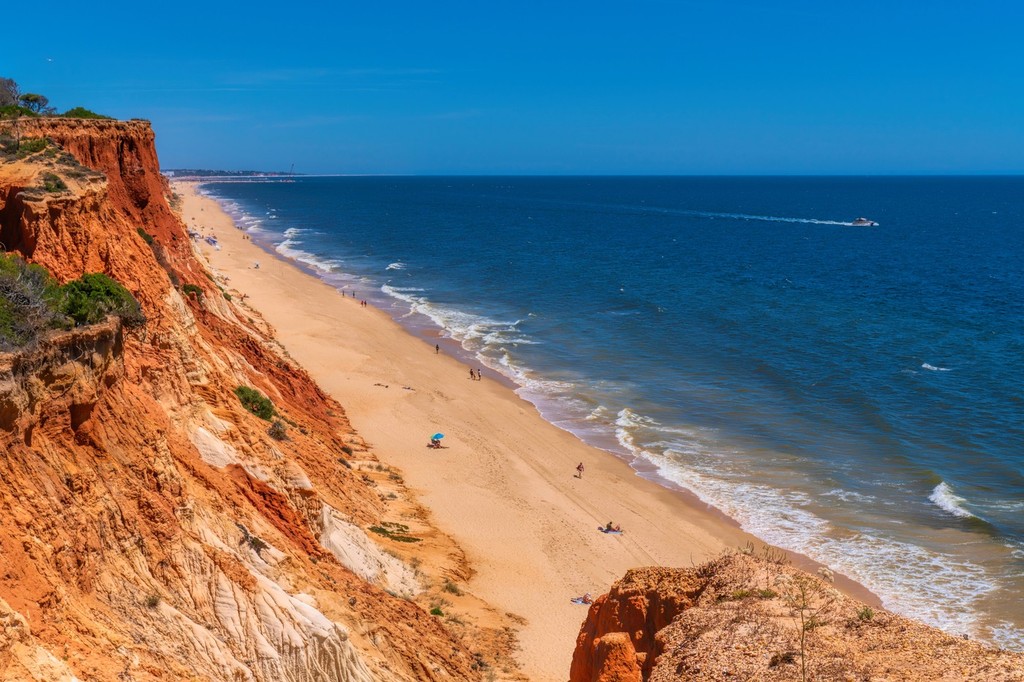 Pre milovníkov majestátnych útesov je vhodná pláž Praia da Falésia v portugalskom Algarve, ktorá uzatvára prvú pätku rebríčka. Zlatistý piesok a more s iskrivou modrou farbou pôsobia pri západe slnka magickým dojmom. Keďže je toto miesto známe vysokými vlnami, ide o ideálnu dovolenkovú destináciu pre surferov.