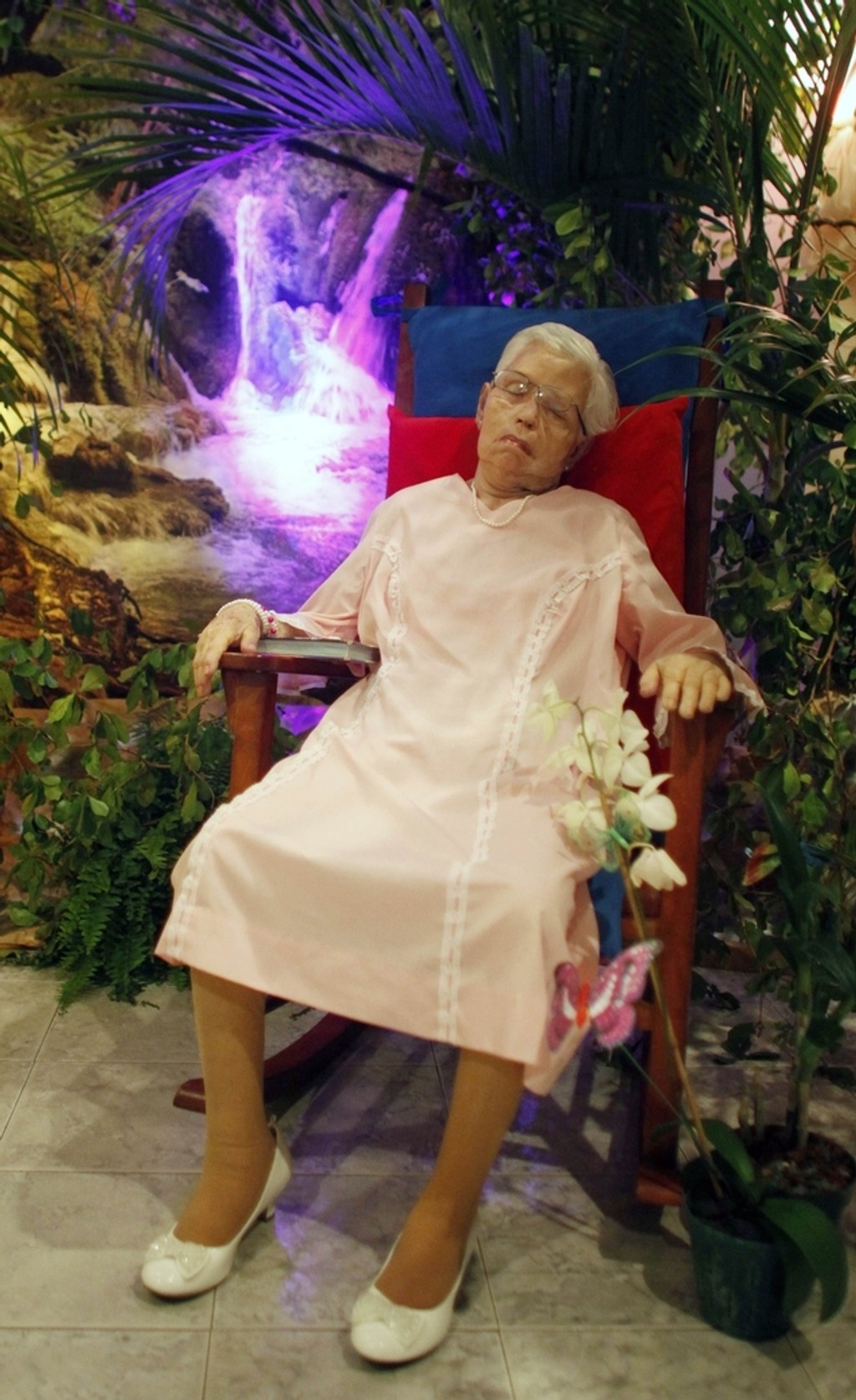 Telo zosnulej 80-ročnej Georginy Chervony Llorenty posadili do jej obľúbeného červeného hojdacieho kresla a obliekli jej svadobné šaty, ktoré mala na sebe pri druhej svadbe pred 32 rokmi. Georgina chcela byť obklopená kvetinami a rastlinami.