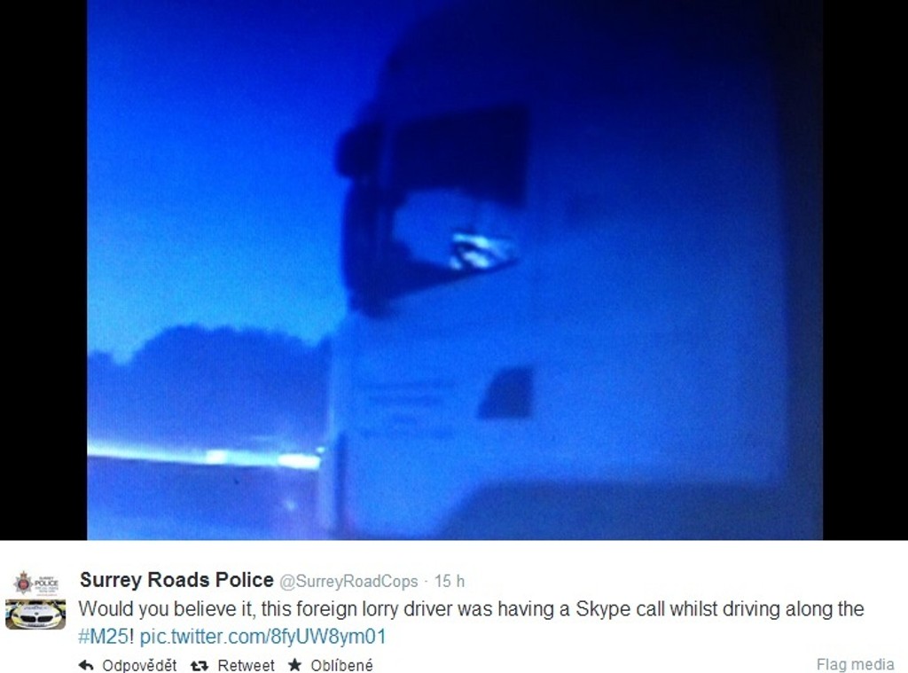 "Verili by ste tomu? Vodič kamiónu skypuje za volantom," napísali britskí policajti na Twitter k fotografii, ktorá už stihla obletieť svet. Na svojom webe ju zverejnil aj portál DailyMail.co.uk.