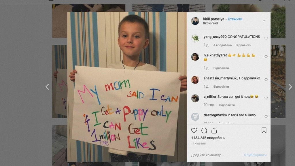 Kyrylo Patselia (9) zverejnil na internete svoju fotografiu, na ktorej držal vlastnoručne vyrobený plagát, na ktorom bolo po anglicky napísané: „Mama mi povedala, že dostanem psa, ak budem mať milión lajkov." Spôsobil tým na webe hotový ošiaľ.