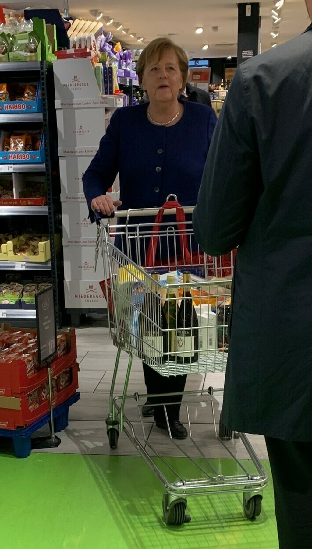 Nemecká kancelárka Angela Merkelová však šla svojím spoluobčanom príkladom, keď sa ju minulý piatok podarilo odfotografovať pri týždňovom nákupe: vo svojom vozíku mala iba jedno balenie toaletného papiera, ale zato štyri fľaše vína.