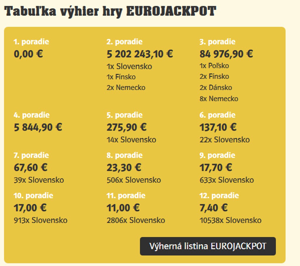„Na tikete pre hru Eurojackpot vyplnili svojimi číslami jedno hracie pole - stĺpec. Jeho vklad do hry bol 2 eurá," informoval hovorca spoločnosti Tipos Rastislav Čépe.