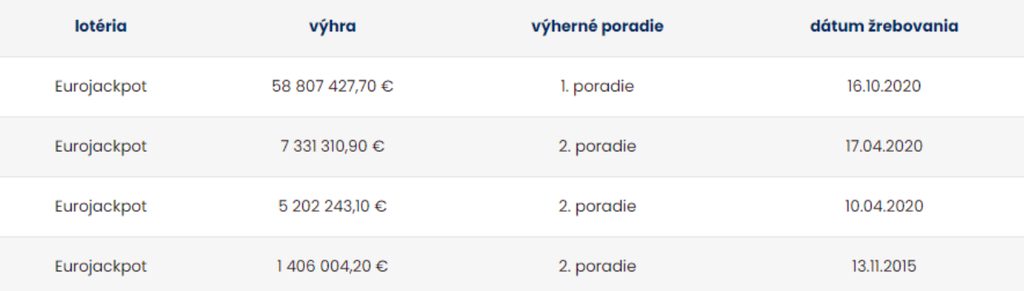 Dodala, že hlavnú výhru v histórii Eurojackpotu získal doteraz Slovák len raz, ale miliónové výhry v druhom poradí získali slovenskí hráči už viackrát (viď tabuľka nižšie).