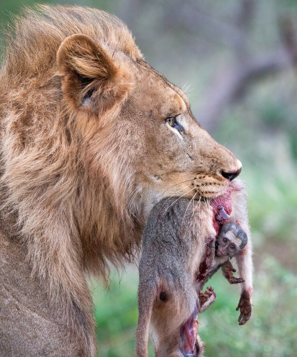 Po chvíli sa ukázalo, že obrovský lev vážiaci takmer 200 kilogramov ulovil samicu paviána. Keď však skupina turistov v Venterom prišla trošku bližšie k svorke, všimli si si mimoriadne znepokojivý detail. Na bezvládnom tele samice paviána spozorovali živé mláďa, ktoré sa zúfalo držalo srsti svojej matky.