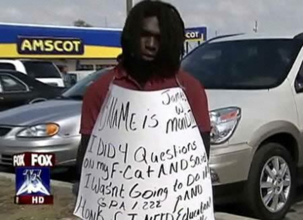 Ronda Holderová bola natoľko sklamaná z akademických výsledkov svojho 15-ročného syna, že ho donútila nosiť po uliciach floridskej Tampy Bay ponižujúci nápis. Poslednou kvapkou v pohári trpezlivosti bolo vraj pre matku to, keď syn James Mond III. prepadol z telesnej výchovy. Ani jeden z rodičov Holderových nemá ukončenú strednú školu, no matka tvrdí, že chce pre syna viac. Ten však nemá záujem študovať.