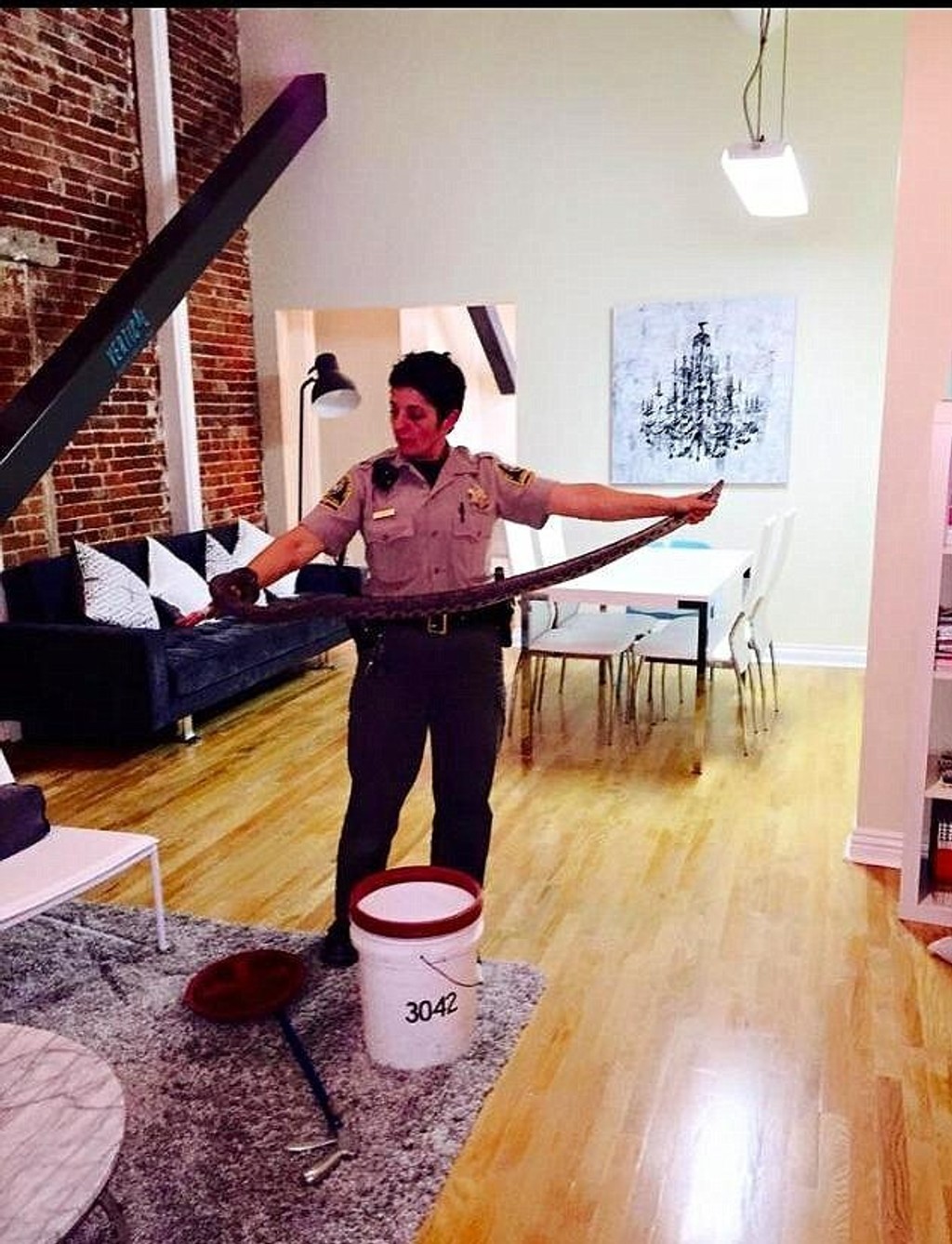 Stephanie si myslela, že záchod opraví sama, no keď sa o to pokúsila, na jej prekvapenie voda vôbec neklesala. Miesto opravy sa jej z toalety podarilo vytiahnuť meter a pol dlhého hada.