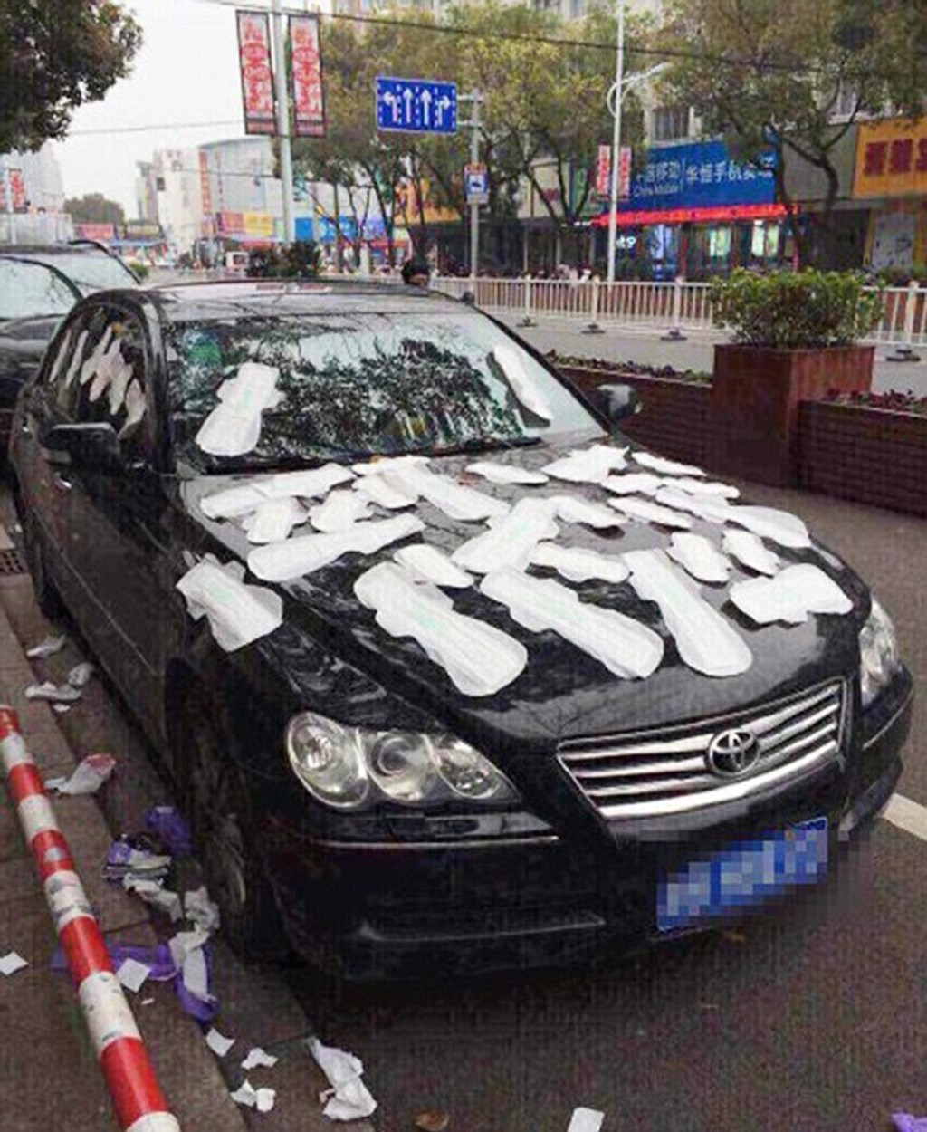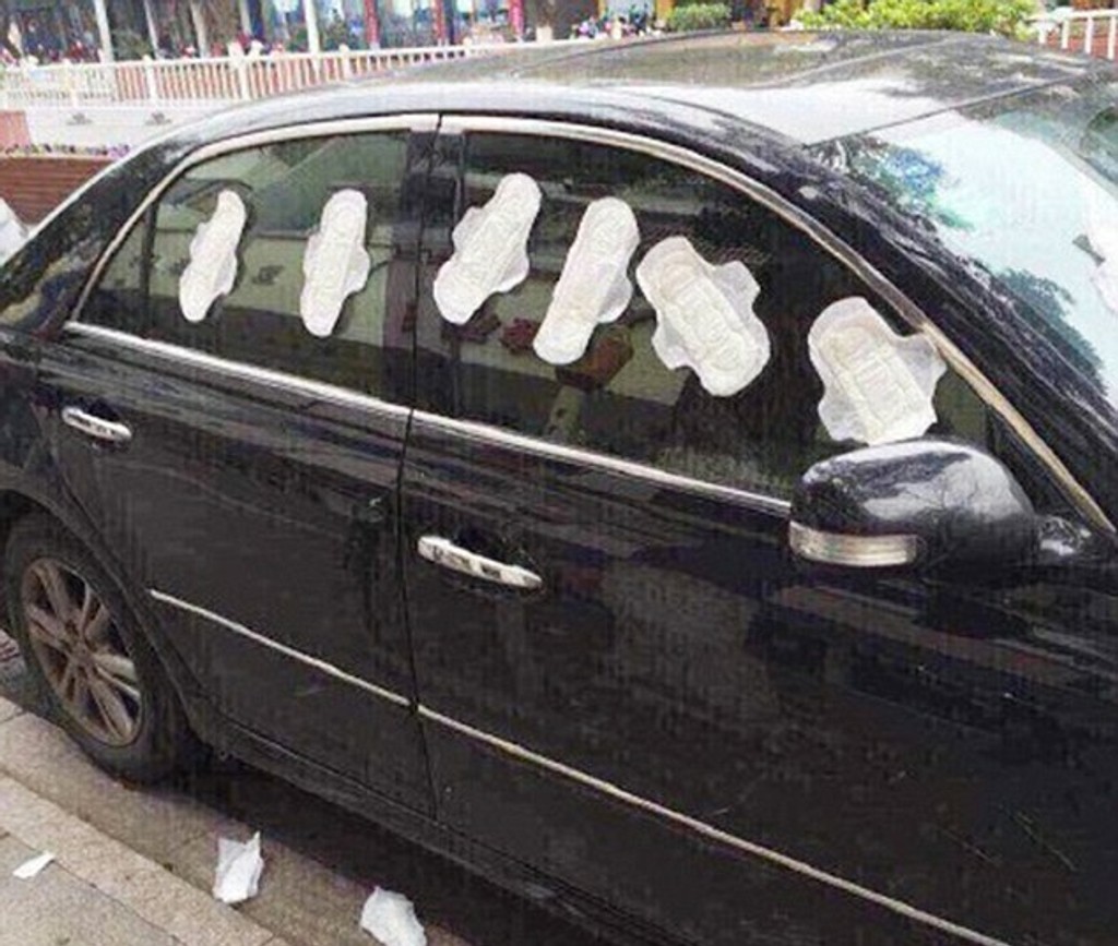 Li Tan (23) mala podozrenie, že jej priateľ De Wu (24) má pomer s inou ženou. Mladík neprišiel domov, tak ako sľúbil, a celú noc sa neukázal. Li preto kúpila 30 hygienických vložiek a polepila mu nimi celé auto. Auto, ktoré stálo na ulici, mal však De len požičané.
