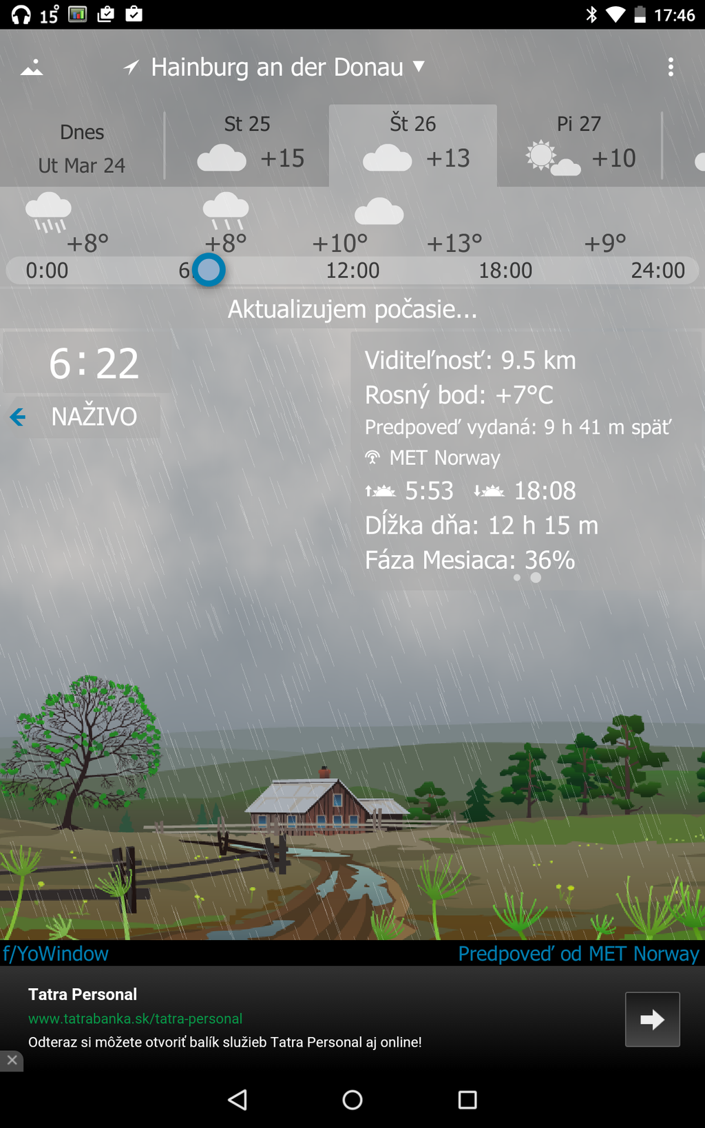 Aplikácií o počasí je pomerne dosť. Prečo vyskúšať práve túto? Pretože je jednoduchá, pekná a s množstvom nastavení. Jej hlavný prínos spočíva v interaktivite - stačí prstom pohybovať doľava alebo doprava a hneď vidíte, aké bolo počasie, resp. aké bude. Ak má pršať, dážď sa objaví aj na obrazovke vášho telefónu. A uvidíte aj to, kedy vyšlo Slnko a kedy bude zapadať. Aplikáciu si môžete stiahnuť tu.