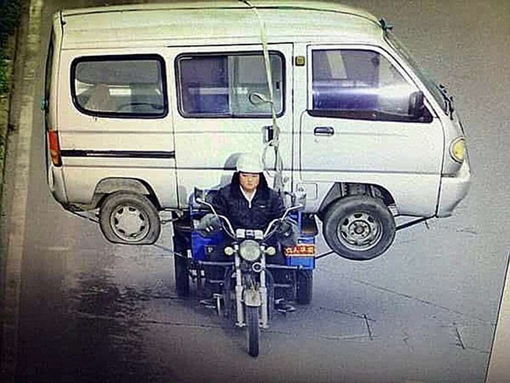 Neznámy motorista sa stal slávny potom, čoho zachytila dopravná kamera. Číňan si na malom motocykle viezol pokazenú dodávku.