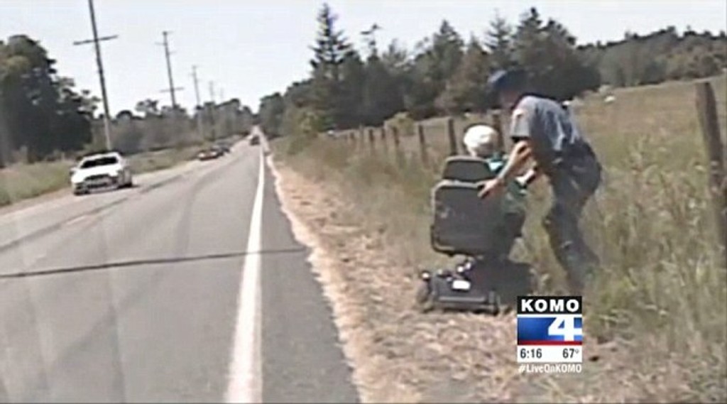Trooper Dave Hintz z Washingtonu našiel 80-ročnú bližšie neidentifikovanú starenku na rušnej ceste State Route 546. Predpísaná minimálna rýchlosť je tam 70 km/h, babička však na elektrickom vozíku išla rýchlosťou len 10 km/h. Dôchodkyňa sa vybrala na kávu do mesta, a potom zablúdila.