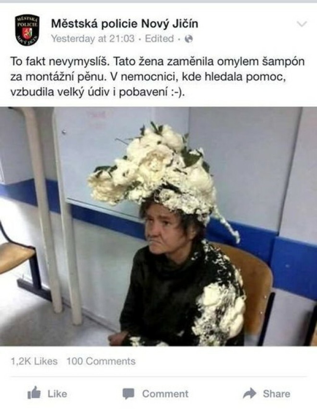 Fotografia s babičkou, ktorá si pomýlila šampón s montážnou penou sa stala hitom internetu u nás aj v Česku. Dôvodom bola interpretácia mestských policajtov z Nového Jičína, ktorí na sociálnej sieti napísali, že ide o českú ženu. Tá mala prísť takto na ošetrenie k lekárovi.