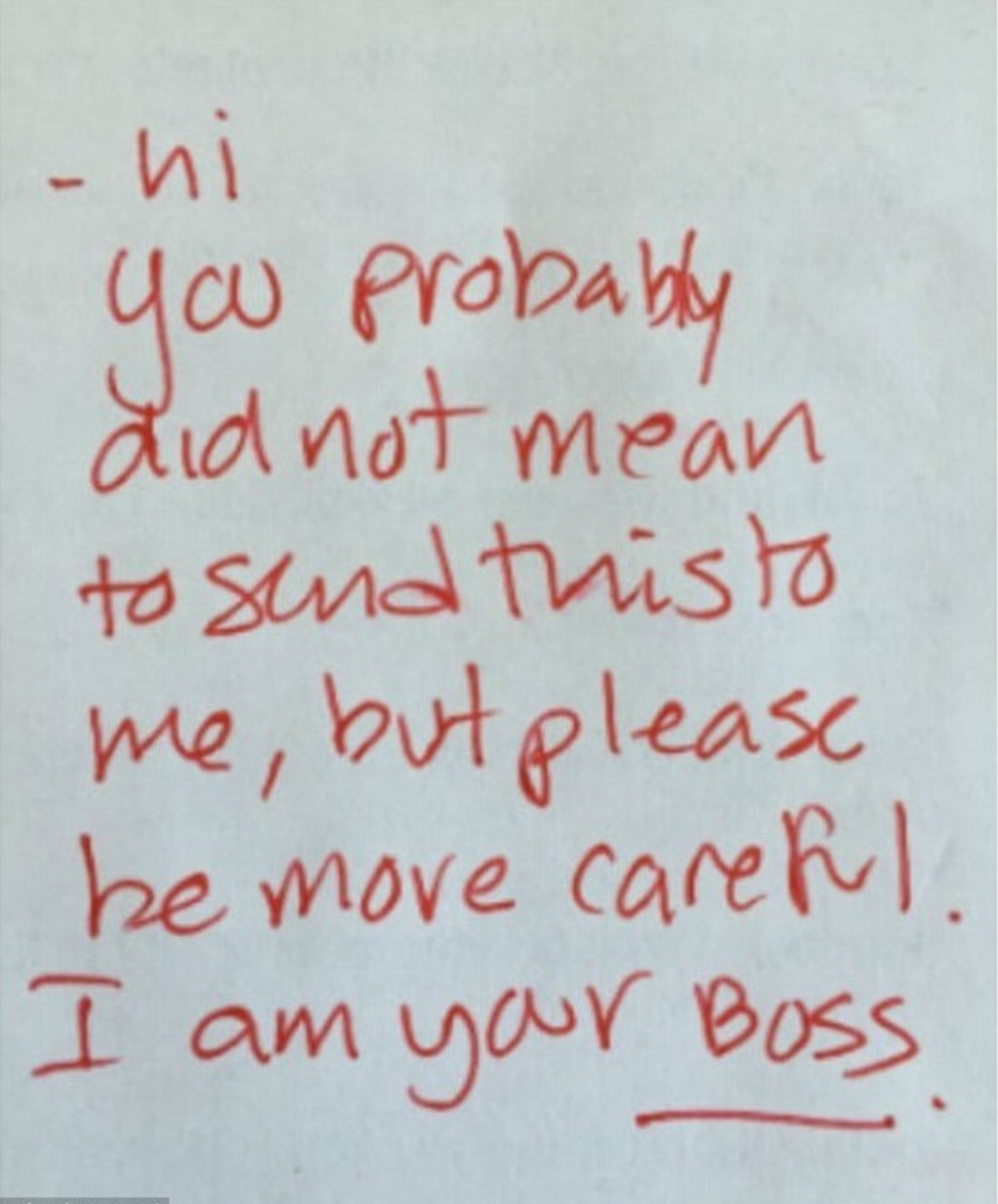 Keď zistila, komu šteklivý záber odoslala, takmer odpadla. Šok ale dostal aj prijímateľ správy, jej šéf. Ten na nezvyčajnú ponuku reagoval promptne. „Ahoj, pravdepodobne si mi toto nechcela poslať, ale prosím ťa, buď opatrnejšia. Som tvoj šéf." S tým, že slovíčko šéf podčiarkol.