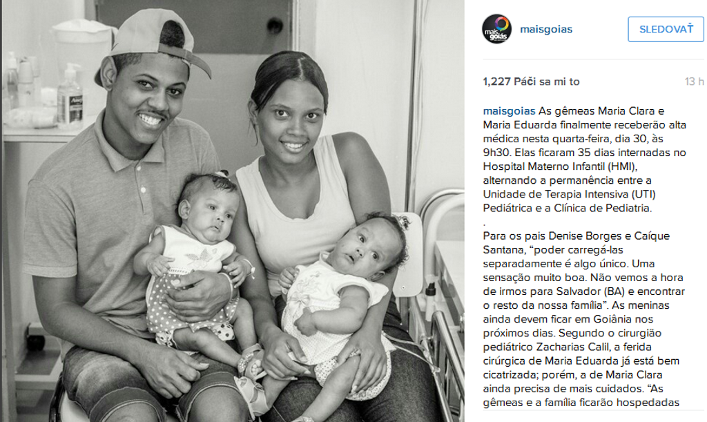 Dvojčatá Maria Clara a Maria Eduarda Santana zo Salvadoru zdieľali podľa portálu MailOnline spoločné brucho a pečeň. Rodičia sa rozhodli dať deťom šancu na plnohodnotný život a dvojčatá tak podstúpili náročnú a riskantnú operáciu. Vďaka 15-tim odborníkom, ktorí boli pri operácii, bol zákrok úspešný.