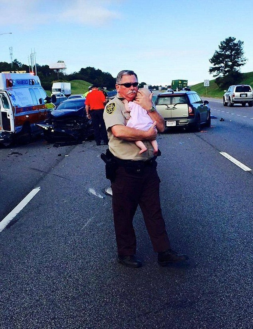 Zástupca šerifa Ric Lindley dorazil na miesto autonehody v Alabame. Pri zrážke sa zranili štyria ľudia. Ric si všimol, že v jednom z áut stále sedí dieťa. Rýchlo ho zobral do náručia, aby ho upokojil. Ricov kolega tento moment zachytil a zverejnil na Facebooku.