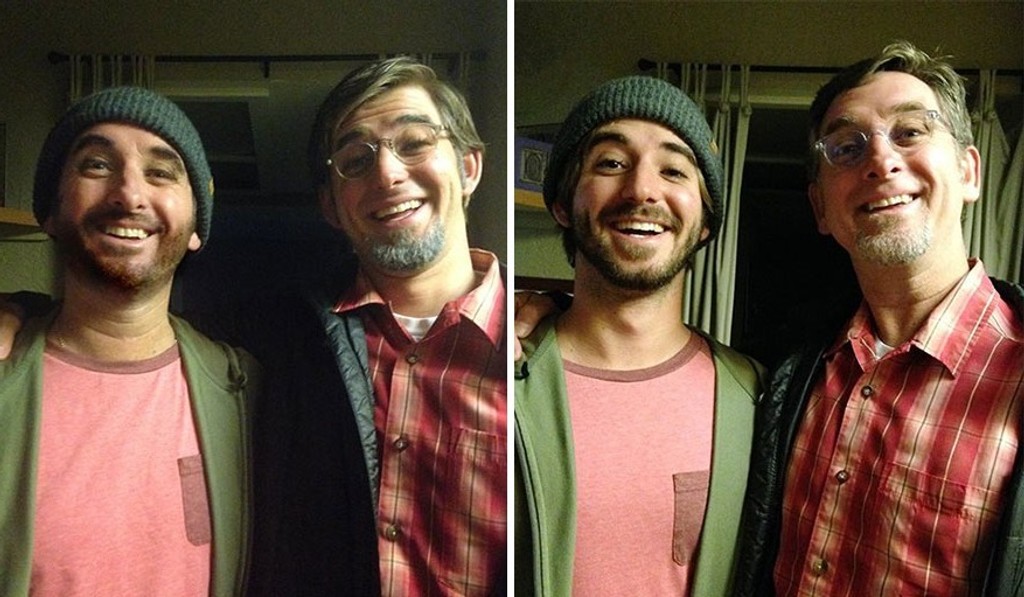 Na prvej snímke je naľavo otec prezlečený za syna a napravo syn prezlečený za otca. A na druhej snímke je naľavo syn a napravo otec.