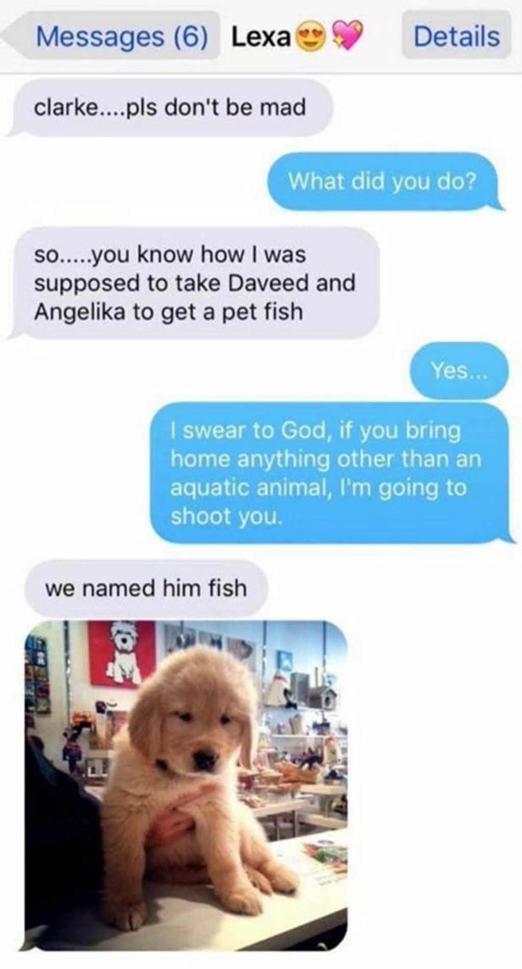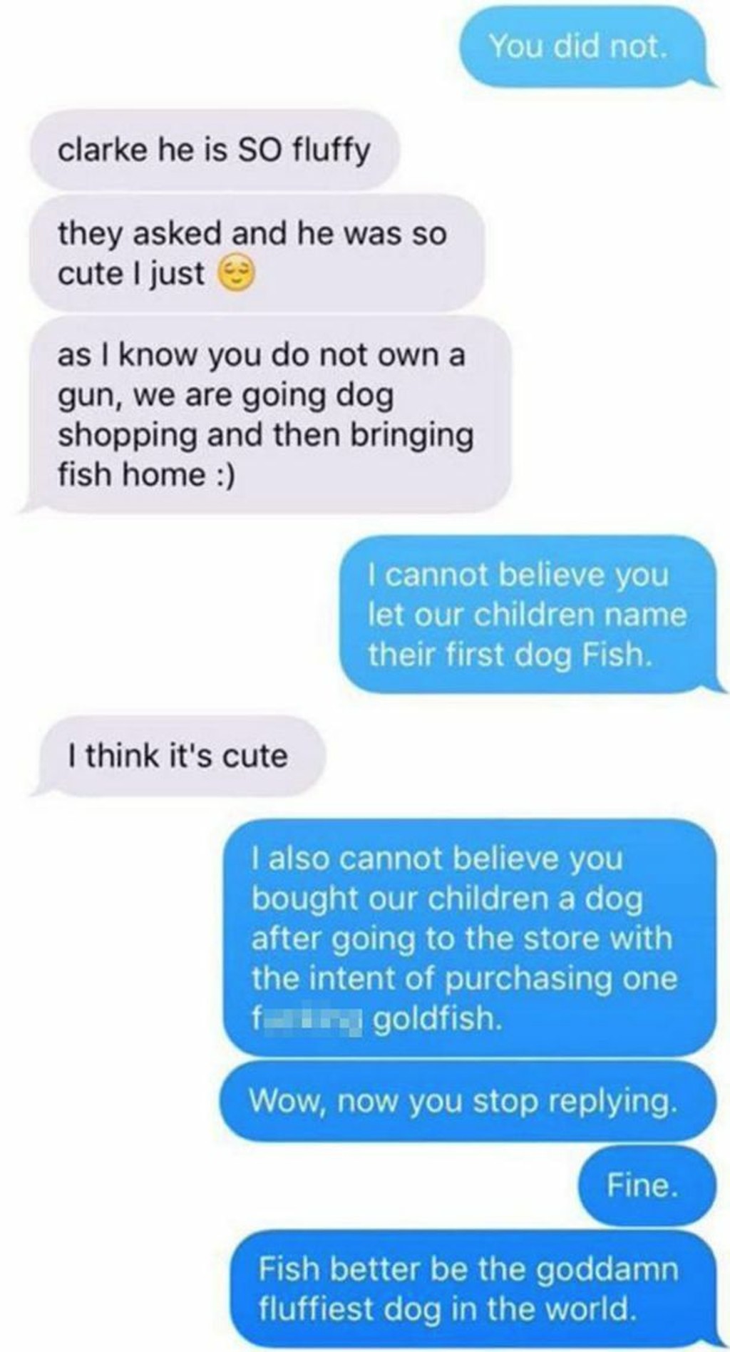 „Clarke, prosím ťa, nebuď nahnevaný," napísala žena. „Čo si urobila?" odpísal. „Vieš, ako som zobrala Daveed a Angeliku kúpiť rybičku," pokračovala žena. „Prisámbohu, že ak si doniesla domov niečo iné okrem vodného zvieratka, zastrelím ťa," dodal zaskočený manžel.