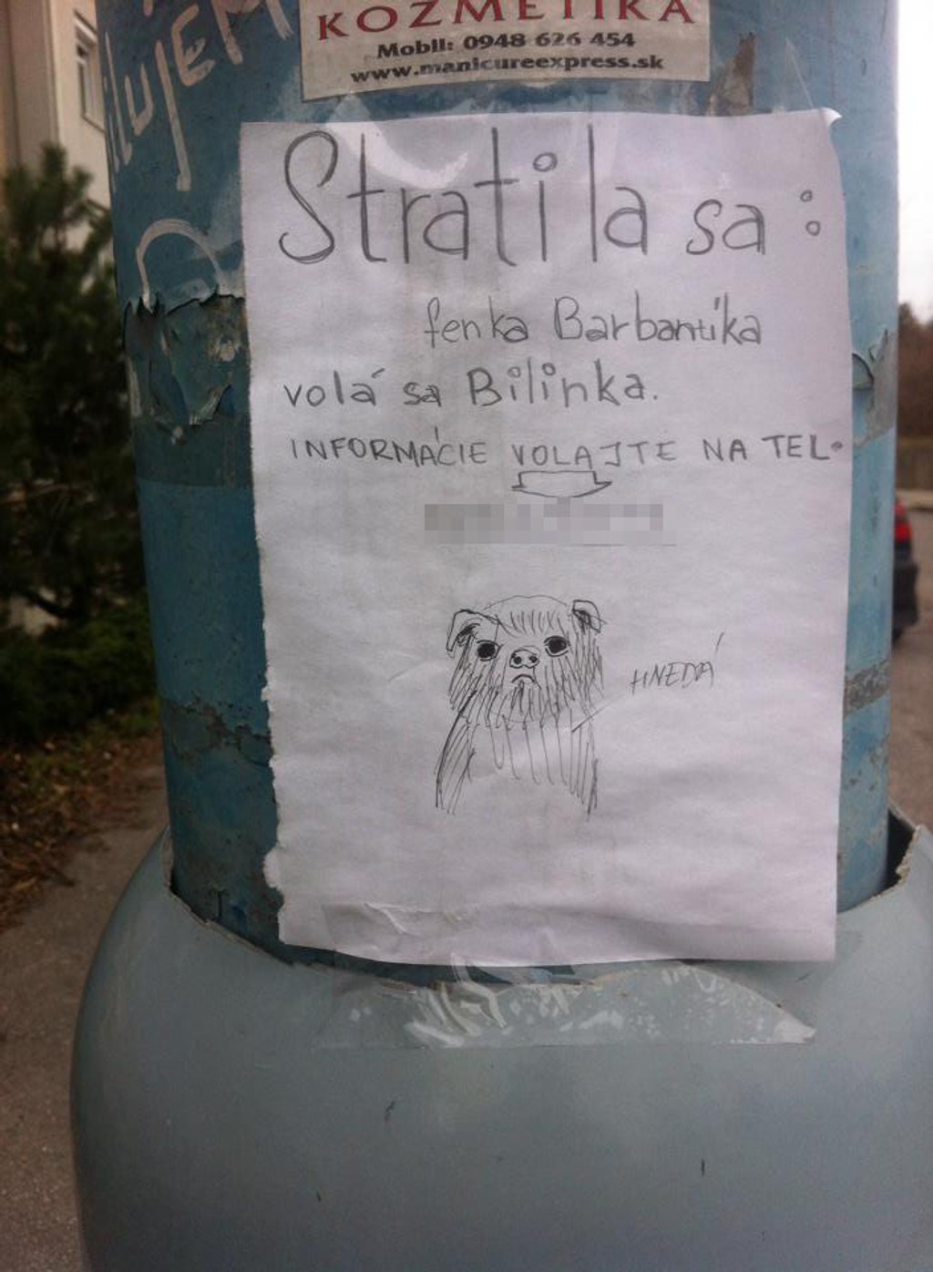 Na Drotárskej ulici v Bratislave našiel náš čitateľ vtipný oznam. „Stratila sa fenka Barbantíka, volá sa Bilinka," píše sa na papieri. Namiesto fotky je dolu nakreslený pes so šípkou, že je hnedý. Pravdepodobne ide o psíka Brabantíka, keďže plemeno Barbantík neexistuje.