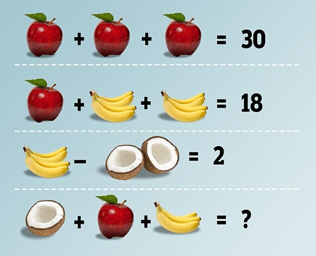 Ak vám vyšiel výsledok 16, postupovali ste nasledovne. Tri jablká majú hodnotu 30, preto jedno jablko bude predstavovať číslo 10. Ak má jablko hodnotu 10 a pripočítame k nemu dva zväzky banánov a výsledok je 18, jeden zväzok banánov má mať hodnotu 4. Zväzok banánov mínus dva kokosy sa rovná 2, preto dva kokosy majú hodnotu 2. A potom prichádza výsledok: 2 + 10 + 4 = 16.