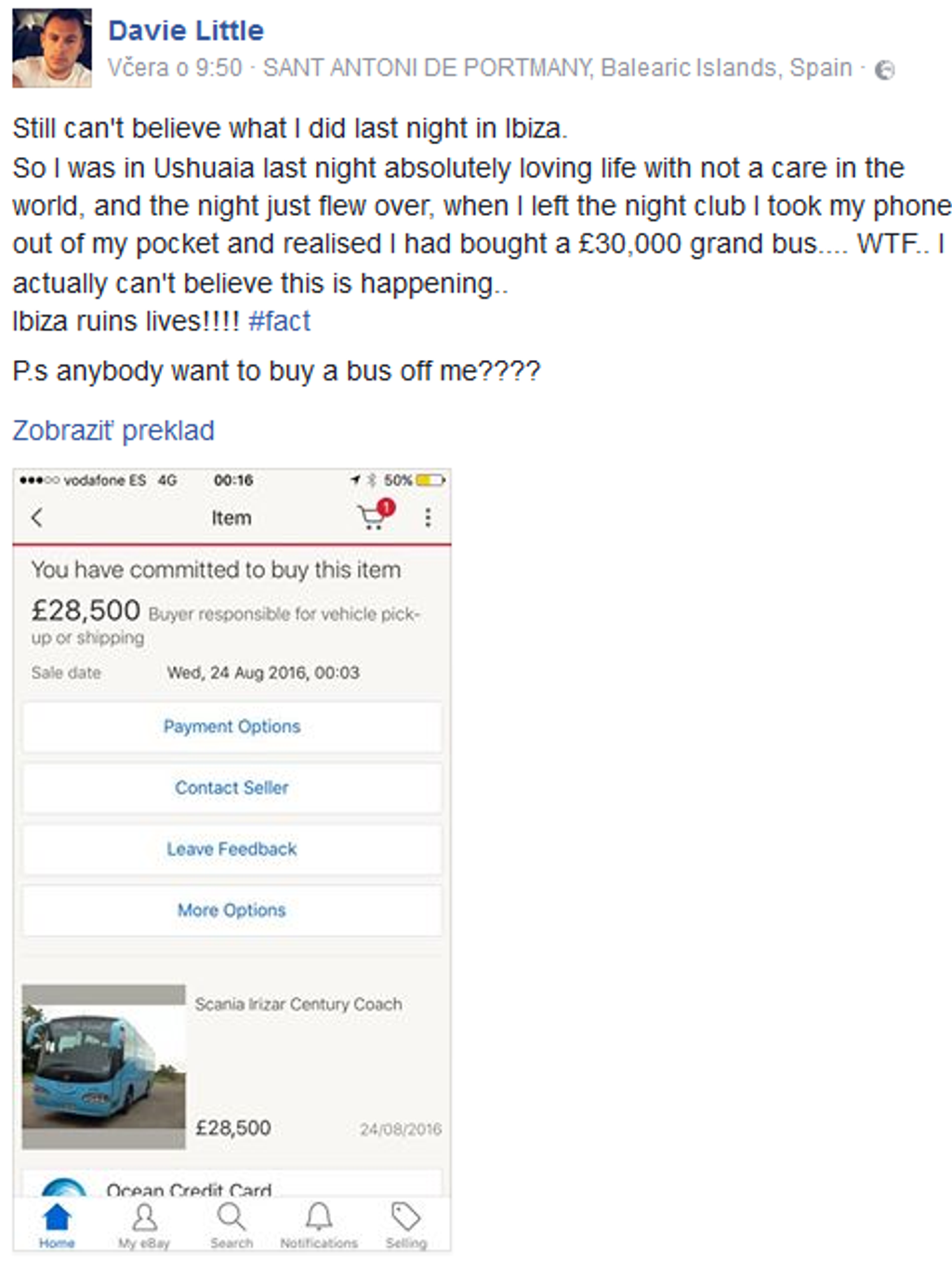 "Celú noc som strávil v klube Ushuaia, užíval som si to, absolútne som sa odviazal a v tom som nejako vytiahol z vrecka mobil a nakúpil som. Keď som si to ráno uvedomil...wtf..ako ma to mohlo napadnúť," napísal na sociálnu sieť 27-ročný Dave Little z Durhamu v Anglicku.