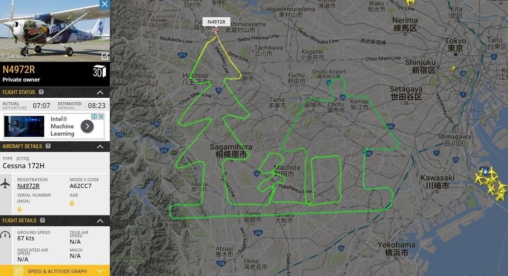 Neznámy pilot si pred vianočnými sviatkami povedal, že urobí niečo originálne. Pripravil si nezvyčajný letový plán - trasu letu naplánoval tak aby pri pohľade zhora pripomínala obrázok ako z vianočnej pohľadnice. Pilot letel na svojom stroji Cessne 172 nad extrémne husto obývanou aglomeráciou Tokio - Jokohama.