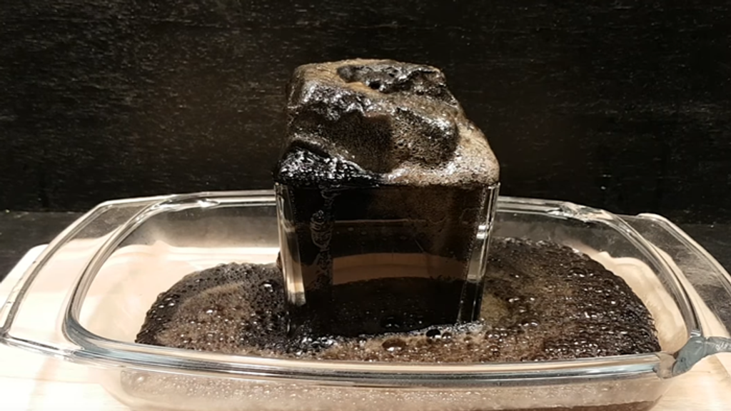 Na záberoch je vidieť, ako autor pokusu nalieva kolový nápoj do látky, ktorá je podobná kyseline žalúdočnej. Reakcia nastane ihneď. Kolový nápoj začne bublať a po opätovnom naliatí vyšumí z pohára von.