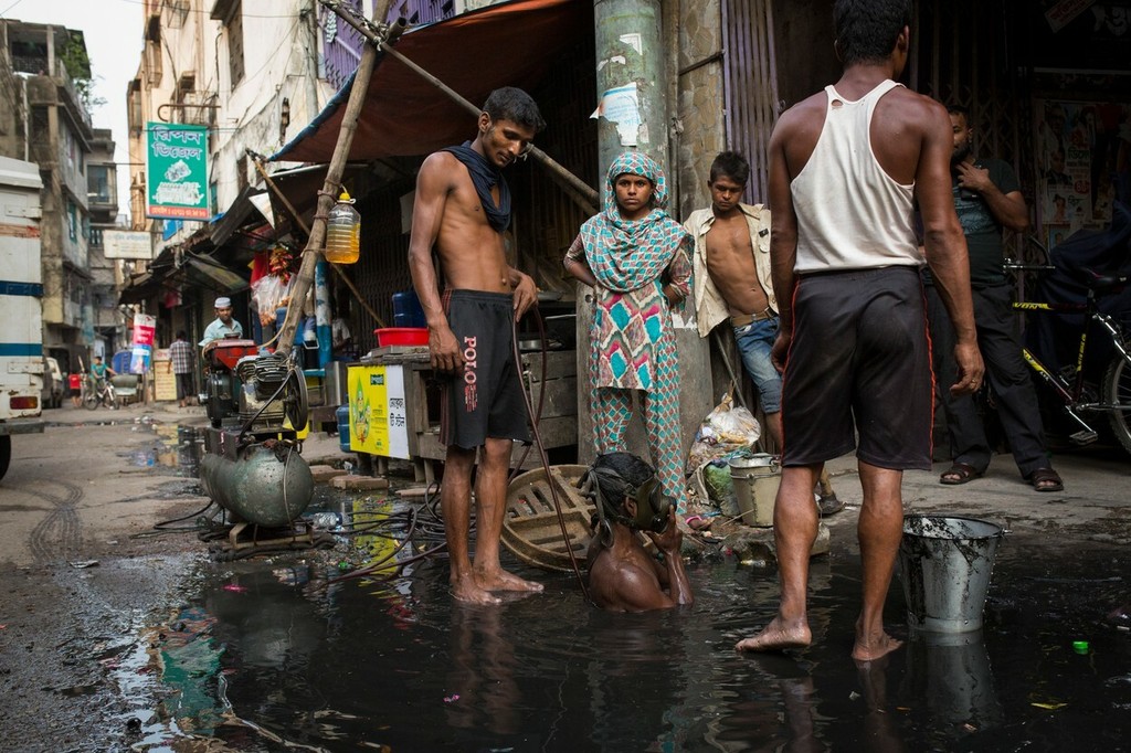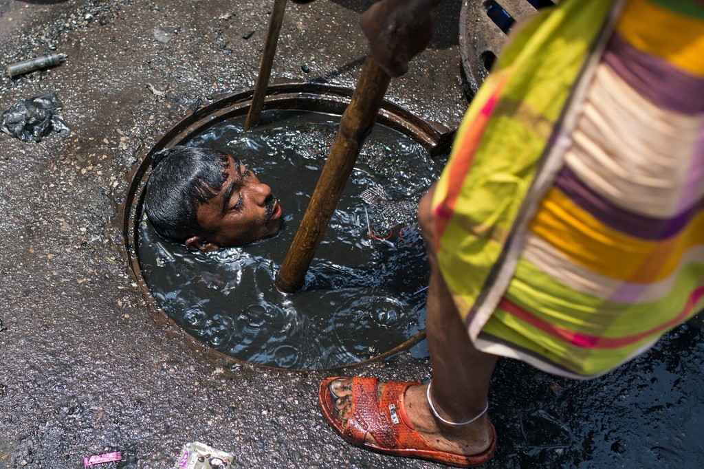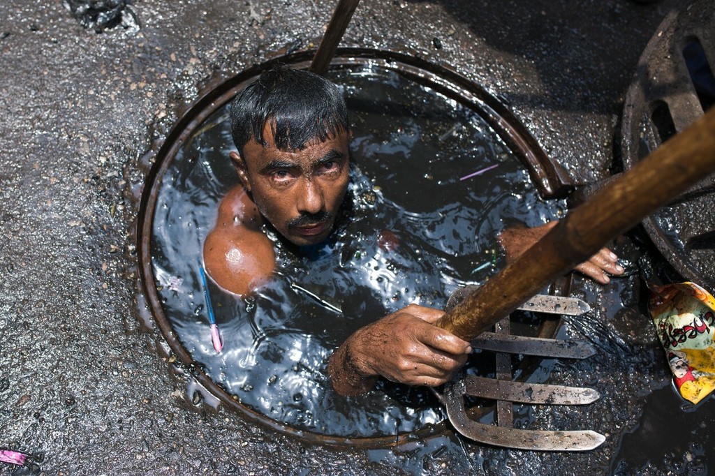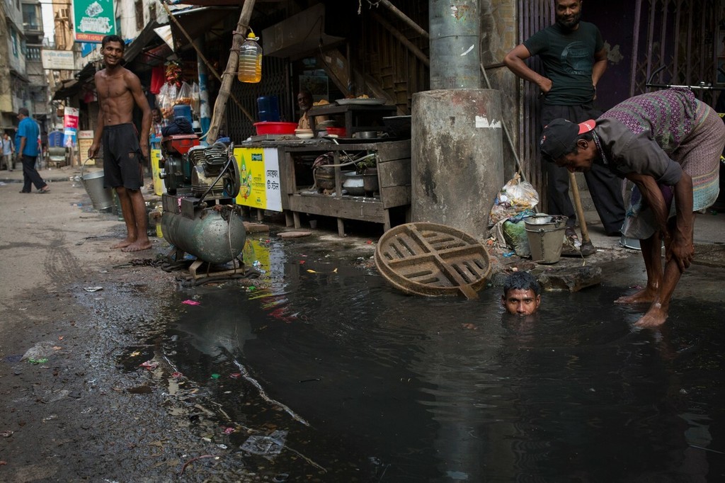 Muž z mesta Dháka, ktorý pracuje pre spoločnosť Dhaka City Corporation, nemá pri robote dostatočné bezpečnostné vybavenie. Pred splaškami a jedovatými výparmi ho často nechráni ani maska, ani rukavice. Jeho najlepším pracovným nástrojom je palica. A to aj napriek alarmujúcemu nárastu počtu úmrtí čističov kanalizácií.